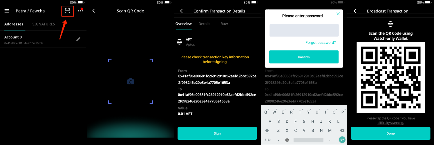 2\. 拿起 Keystone ，點擊 \[-] 圖標掃描 Petra 中顯示的二維碼。查看交易並點擊 \[Sign] > 輸入您的密碼並點擊 \[Confirm]。然後，二維碼將顯示在您的 Keystone 硬件錢包上。