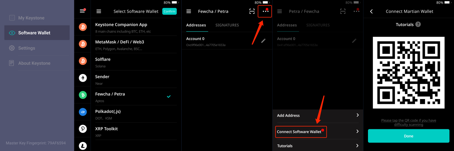 2\. 在 Keystone 上，導航至 \[Software Wallet] > 點擊 \[Fewcha/Petra] > 點擊 \[...]，然後點擊 \[Connect Software Wallet]。然後將顯示二維碼。