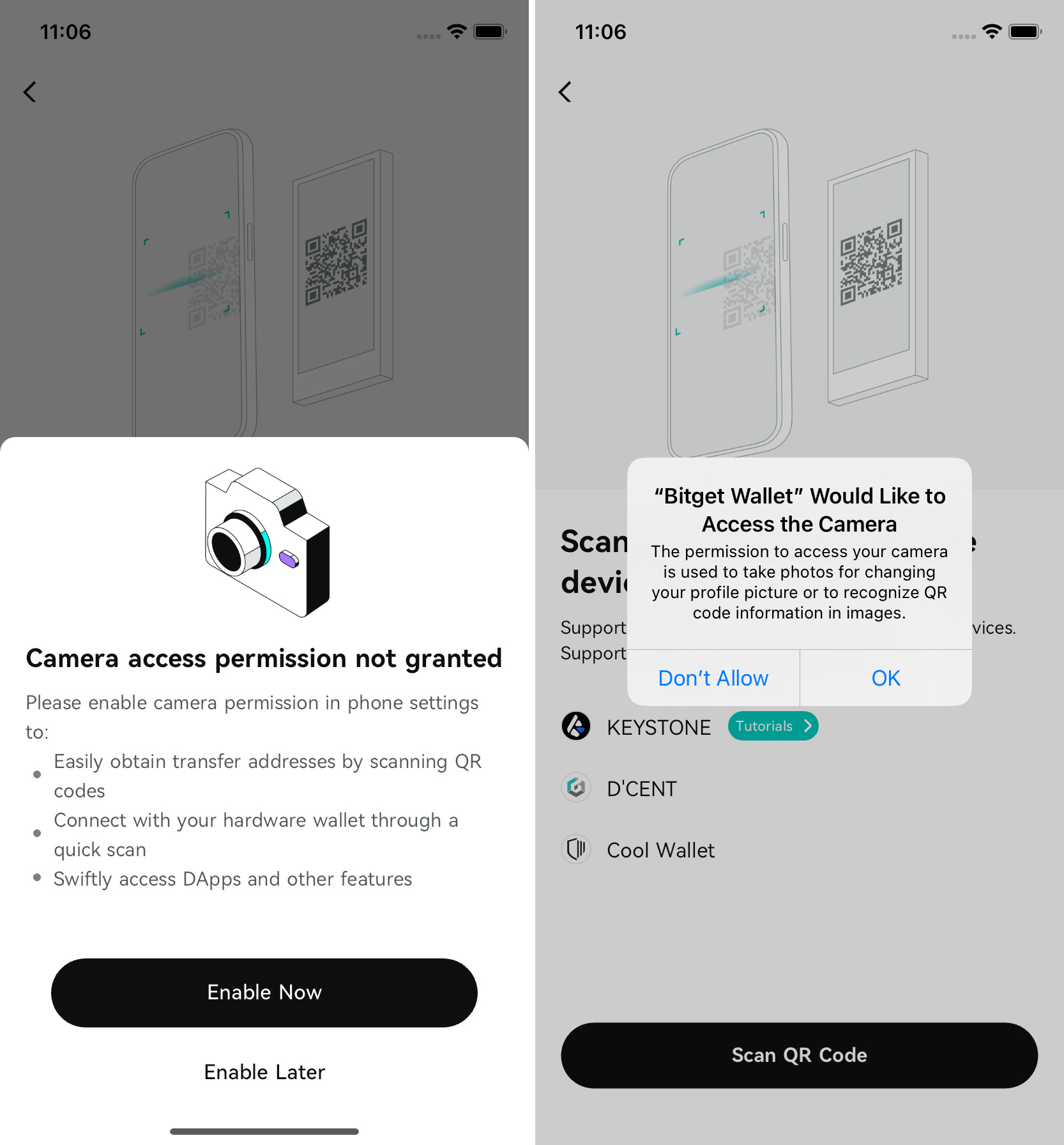 6. 開啟權限後會跳到掃碼介面，此時掃描 Keystone 上顯示的二維碼即可，然後選擇你需要管理的幣種地址/賬戶。