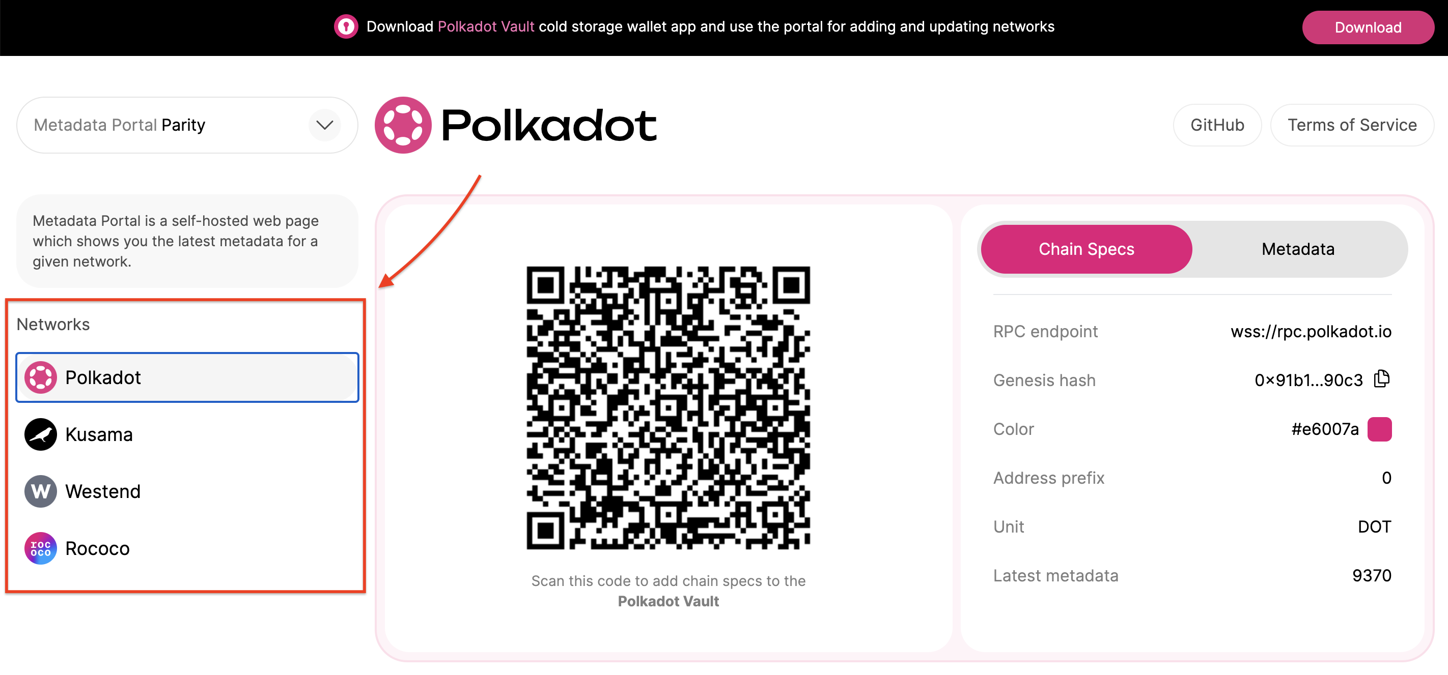1. 點擊提供的鏈接，訪問 Keystone 的 [Metadata 門戶](https://metadata.parity.io/#/polkadot)。