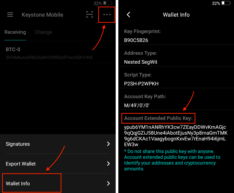3. 點擊 \[錢包信息] 將顯示 XPUB。