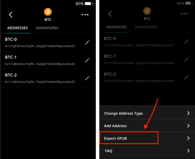 3. 點擊\[導出 XPUB]，XPUB將顯示為二維碼，具體詳情如下。